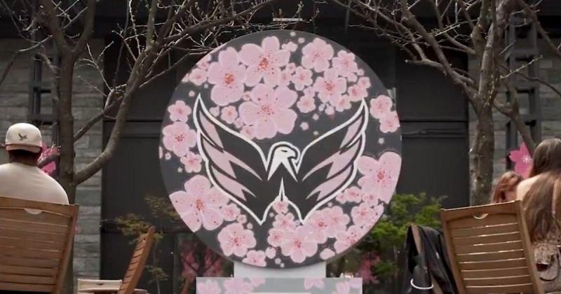 Фанаты «Вашингтона» помогли раскрасить скульптуру в форме шайбы с цветками вишни.